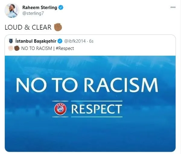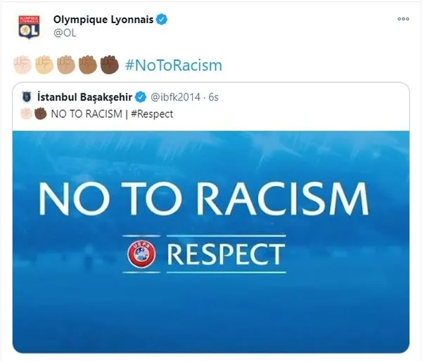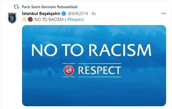 Medipol Başakşehir'in Twitter'da paylaştığı "Irkçılığa hayır" mesajını alıntılayan PSG Kulübü'nün yanı sıra karşılaşmada forma giyen PSG'li futbolcular Mbappe ve Kimpembe de olaya sessiz kalmadı.