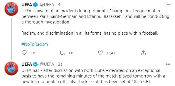 UEFA, Twitter hesabından yaptığı açıklamada, PSG-Medipol Başakşehir maçı hakkında soruşturma açılacağını belirterek, "Ayrımcılığın hiçbir türüne futbolda yer yok." ifadesini kullandı.