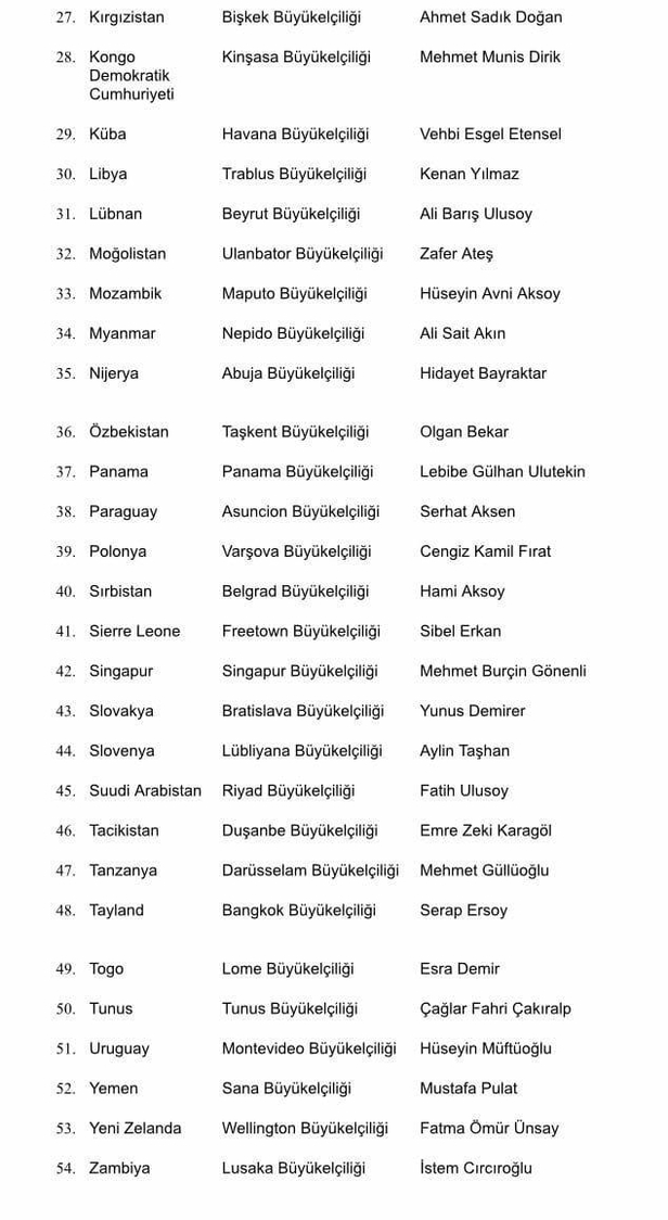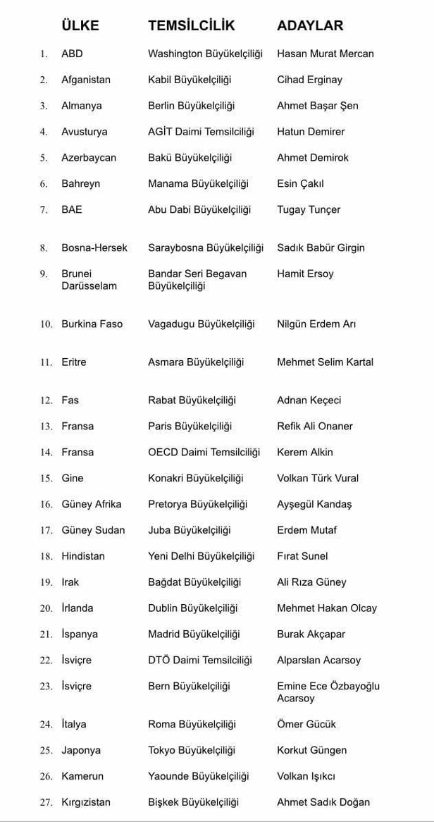 Buna göre, AFAD Başkanı Mehmet Güllüoğlu, Türkiye'nin Tanzanya'daki Darüsselam Büyükelçiliği görevine getirilirken, Cihad Erginay'a Türkiye'nin Kabil Büyükelçiliği, Ahmet Başar Şen'e Türkiye'nin Berlin Büyükelçiliği, Hatun Demirer'e Türkiye'nin AGİT Nezdindeki Daimi Temsilciliği, Ahmet Demirok'a Türkiye'nin Bakü Büyükelçiliği görevleri verildi.