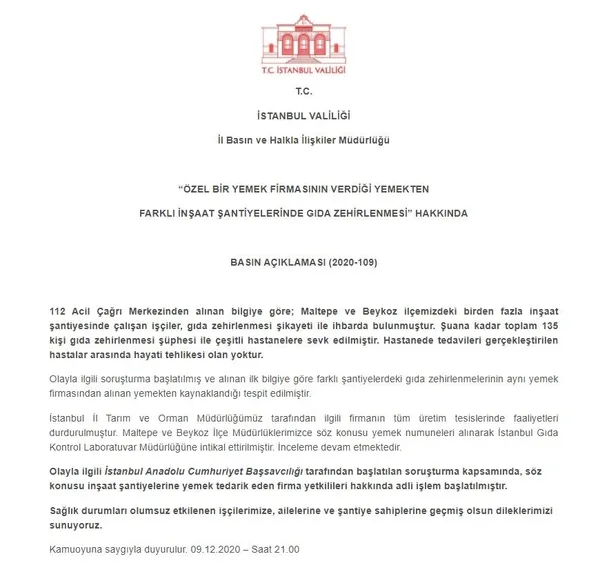 Valilikten yapılan açıklamada, "112 Acil Çağrı Merkezinden alınan bilgiye göre; Maltepe ve Beykoz ilçemizdeki birden fazla inşaat şantiyesinde çalışan işçiler, gıda zehirlenmesi şikayeti ile ihbarda bulunmuştur. Şuana kadar toplam 135 kişi gıda zehirlenmesi şüphesi ile çeşitli hastanelere sevk edilmiştir. Hastanede tedavileri gerçekleştirilen hastalar arasında hayati tehlikesi olan yoktur" denildi.