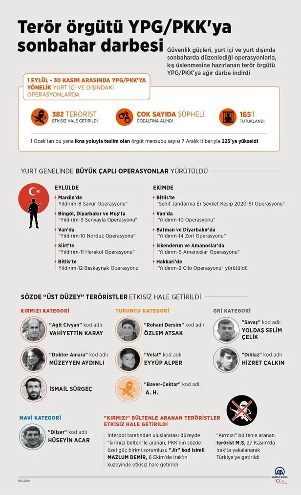 Güvenlik güçleri, ülkenin barış ve huzurunu bozmaya yönelik hain saldırılar düzenleyen terör örgütü YPG/PKK'ya yurt içi ve dışında hava ve kara operasyonlarıyla karşılık verdi. Sonbaharda yurt içi ve dışındaki operasyonlarda aralarında sözde sorumluların da bulunduğu 382 terörist etkisiz hale getirildi.