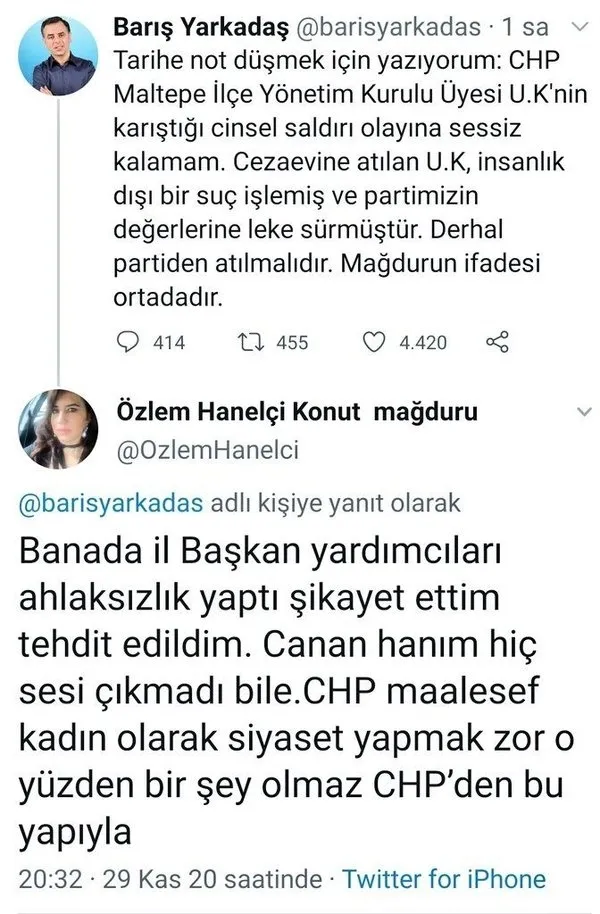 Barış Yarkadaş, parti içindeki taciz ve tecavüz skandalları ile ilgili resmi sosyal medya hesabından, "Tarihe not düşmek için yazıyorum: CHP Maltepe İlçe Yönetim Kurulu Üyesi U.K'nin karıştığı cinsel saldırı olayına sessiz kalamam. Cezaevine atılan U.K, insanlık dışı bir suç işlemiş ve partimizin değerlerine leke sürmüştür. Derhal partiden atılmalıdır. Mağdurun ifadesi ortadadır.