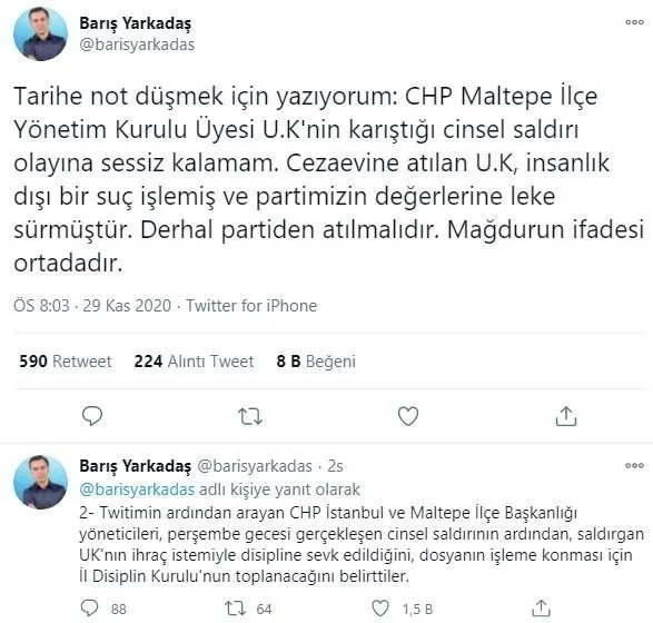 Twitimin ardından arayan CHP İstanbul ve Maltepe İlçe Başkanlığı yöneticileri, perşembe gecesi gerçekleşen cinsel saldırının ardından, saldırgan U.K'nın ihraç istemiyle disipline sevk edildiğini, dosyanın işleme konması için İl Disiplin Kurulu'nun toplanacağını belirttiler" ifadelerini kullanmıştı.
