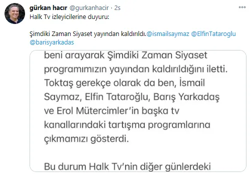 "Halk TV Genel Yayın Yönetmeni Suat Toktaş beni arayarak Şimdiki Zaman Siyaset programımızın yayından kaldırıldığını iletti. Toktaş gerekçe olarak da ben, İsmail Saymaz, Elfin Tataroğlu, Barış Yarkadaş ve Erol Mütercimlerin'in başka TV kanallarındaki tartışma programlarına çıkmamızı gösterdi. Bu durum Halk TV'nin diğer günlerdeki raitinglerini etkiliyormuş. Son 2 sezonda tam 28 hafta tüm haber kanalları içerisinde gün birinciliğini bize veren izleyicilerimize ve onlarla buluşmamızı sağlayan Halk TV'ye teşekkür ederiz. Başka mecralarda görüşmek üzere..."