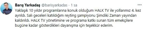 Söz konusu yayın ile ilgili Twitter hesabından açıklama yapan Yarkadaş "Yaklaşık 10 yıldır programlarına konuk olduğum HALK TV ile yollarımız 4. kez ayrıldı. Salı geceleri katıldığım reyting şampiyonu Şimdiki Zaman yayından kaldırıldı. HALK TV yönetimine ve programa katkı sunan tüm emekçilere bugüne kadar gösterdikleri dayanışma için teşekkür ederim" ifadelerini kullandı.
