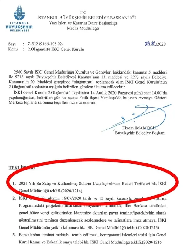 "İBB Yönetimi 1,5 yılda 4. kez zam teklifi getiriyor; Kasım 2019'da ortalama yüzde 80, Temmuz 2020'de yüzde 40, Kasım 2020'de ortalama yüzde 35 zam teklifi getirdi. Son olarak 14 Aralık (bugün) yine zam talebi ile İSKİ Genel Kurulumuz olağanüstü toplantıya çağrılıyor."