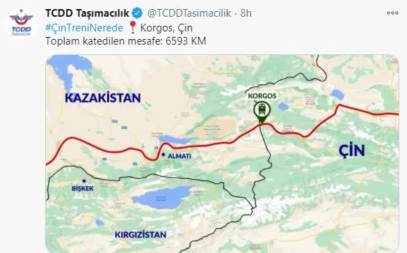 Türkiye Cumhuriyeti Devlet Demiryolları Taşımacılık AŞ tarafından yapılan açıklamada; İstanbul'dan törenle uğurlanan ilk ihracat treninin Çin Korgos'a ulaştığı bildirildi. TCDD Taşımacılık AŞ, a toplam katedilen mesafenin 6 bin 593 kilometre olduğu da açıkladı.