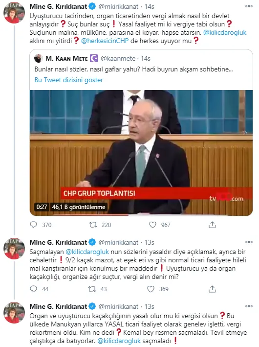 Kırıkkanat, ilk olarak "Uyuşturucu tacirinden, organ ticaretinden vergi almak nasıl bir devlet anlayışıdır. Suç bunlar suç. Yasal faaliyet mi ki vergiye tabi olsun. Suçlunun malına, mülküne, parasına el koyar, hapse atarsın. Kemal Kılıçdaroğlu aklını mı yitirdi? @herkesicinCHP de herkes uyuyor mu?" ifadelerini kullandı.