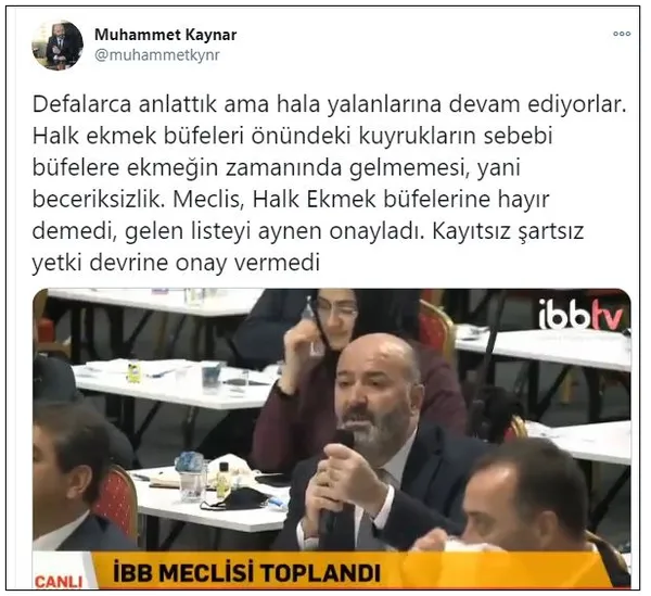 Muhammed Kaynar; İBB Başkanı Ekrem İmamoğlu'nun, "Şehit, gazi ve engelli ailelerinin işletmesi kaydıyla Halk Ekmek büfelerinin sayısının artırılması talebimizde de ne olursa olsun ısrar edeceğiz" şeklindeki ifadelerinin de gerçeği yansıtmadığını açıkladı ve "(Halk ekmek büfelerinin işletilmesi teklifi) Bu teklifin hiçbir yerinde ne şehitten ne gaziden ne de engelliden bahsediliyor.." ifadelerini kullandı.