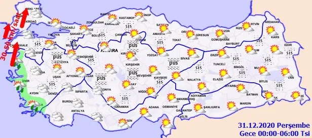 Meteoroloji Genel Müdürlüğü tarafından yapılan son değerlendirmelere göre, ülkemizin batı kesimlerinin parçalı yer yer çok bulutlu, Kıyı Ege ile Edirne, Çanakkale, Balıkesir'in batısı, Antalya, Isparta'nın güneyi ve Burdur'un doğusunun aralıklı yağmur ve sağanak yağışlı, diğer yerlerin az bulutlu ve açık geçeceği tahmin ediliyor. Sabah ve gece saatlerinde iç ve doğu kesimlerde yer yer buzlanma ve don ile birlikte sis ve pus olayı bekleniyor.