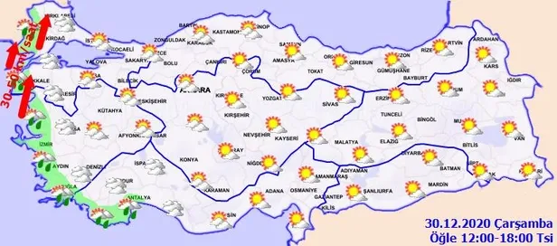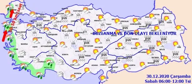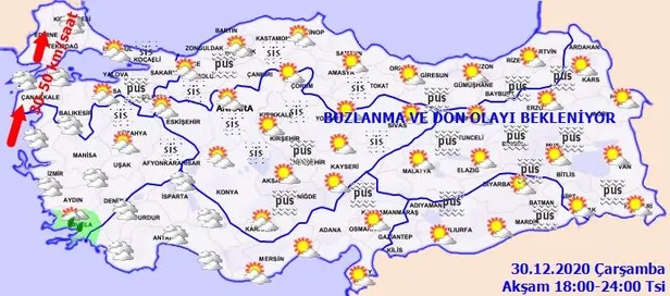 Meteoroloji Genel Müdürlüğünden son dakika hava durumu uyarıları gelmeye devam ediyor. Yapılan son değerlendirmelere göre, ülkemizin batı kesimlerinin parçalı yer yer çok bulutlu, Kıyı Ege ile Edirne, Çanakkale, Balıkesir'in batısı, Antalya, Isparta'nın güneyi ve Burdur'un doğusunun aralıklı yağmur ve sağanak yağışlı, diğer yerlerin az bulutlu ve açık geçeceği tahmin ediliyor. Sabah ve gece saatlerinde iç ve doğu kesimlerde yer yer buzlanma ve don ile birlikte sis ve pus olayı bekleniyor. Peki, İstanbul, Ankara ve İzmir'de hava nasıl olacak? İşte, 30 Aralık il il hava durumu tahminleri...