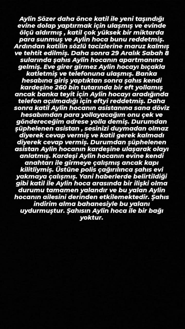 Aylin Sözer daha önce katil ile yeni taşındığı evine dolap yaptırmak için ulaşmış ve evinde ölçü aldırmış, katil çok yüksek bir miktarda para sunmuş ve Aylin Hoca bunu reddetmiş. Ardından katilin sözlü tacizlerine maruz kalmış ve tehdit edilmiş. Daha sonra 29 Aralık sabah 8 sularında şahıs Aylin hocanın apartmanına gelmiş.