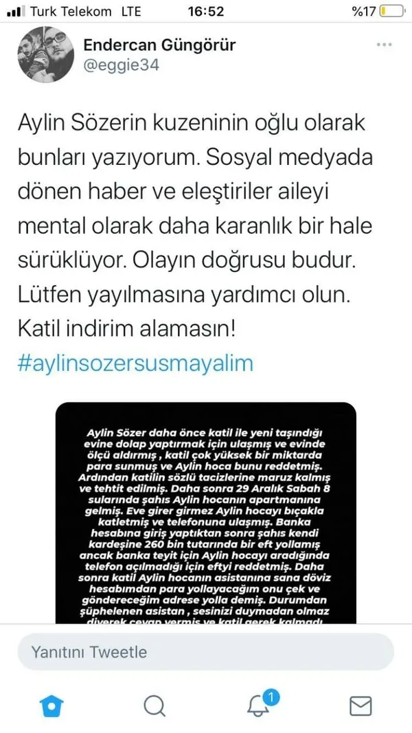 Konuyla ilgili flaş açıklamalarda bulunan Aylin Sözer'in akrabası Endercan Güngörür, katil zanlısının ilişki yalanını indirim almak için söylediği belirtti.
