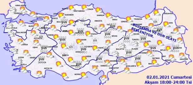 Meteoroloji Genel Müdürlüğünden son dakika hava durumu uyarıları gelmeye devam ediyor. Yapılan son değerlendirmeye göre, ülkemizin güney ve batısı parçalı ve çok bulutlu, Ege kıyıları, bugün Kahramanmaraş, Gaziantep, Kilis, Malatya, Tunceli çevreleri ile Osmaniye'nin doğu, Adıyaman’ın batı kesimlerinin, yarın sabah saatlerinden itibaren Çanakkale çevrelerinin yağmur ve sağanak yağışlı diğer yerlerin az bulutlu geçeceği tahmin ediliyor. Sabah ve gece saatlerinde ülkemizin doğusunda buzlanma ve don ile iç ve doğu bölgelerde yer yer pus ve sis hadisesi bekleniyor. Peki, İstanbul, Ankara ve İzmir'de hava nasıl olacak? İşte, 2 Ocak il il hava durumu tahminleri...