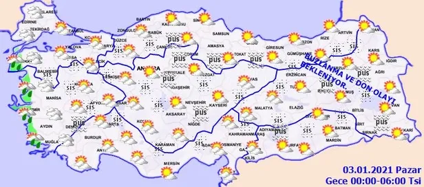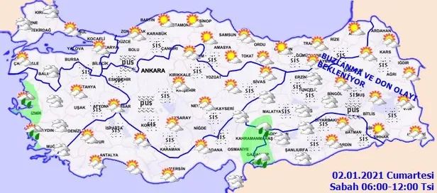 Meteoroloji Genel Müdürlüğü tarafından yapılan son değerlendirmelere göre, ülkemizin güney ve batısı parçalı ve çok bulutlu, Ege kıyıları, bugün (Cumartesi) Kahramanmaraş, Gaziantep, Kilis, Malatya, Tunceli çevreleri ile Osmaniye'nin doğu, Adıyaman'ın batı kesimlerinin, yarın (Pazar) sabah saatlerinden itibaren Çanakkale çevrelerinin yağmur ve sağanak yağışlı diğer yerlerin az bulutlu geçeceği tahmin ediliyor. Sabah ve gece saatlerinde ülkemizin doğusunda buzlanma ve don ile iç ve doğu bölgelerde yer yer pus ve sis hadisesi bekleniyor.
