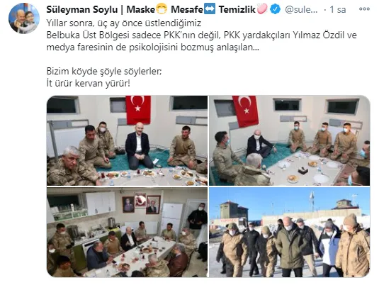 "Yıllar sonra, üç ay önce üstlendiğimiz Belbuka Üst Bölgesi sadece PKK'nın değil, PKK yardakçıları Yılmaz Özdil ve medya faresinin de psikolojisini bozmuş anlaşılan... Bizim köyde şöyle söylerler; İt ürür kervan yürür!"