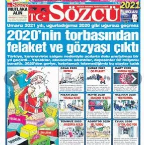 Sözcü gazetesi yılbaşının ertesi günü "2020'nin torbasından gözyaşı ve felaket çıktı" manşetiyle çıktı. Ayasofya'nın ibadete açılması da gazeteye göre başımıza gelen büyük felaketlerdendi.