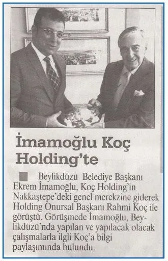 Koç Holding, seçim döneminde CHP'li Ekrem İmamoğlu’nun en büyük destekçilerinden bir tanesi olmuştu. Koç'un desteğiyle koltuğu kapan İmamoğlu'nun geri ödeme mesaisi başladı! İmamoğlu'nun grup bünyesindeki firmalara milyonluk ihalelerle ihya ettiği belirlendi. İmamoğlu’nun talimatıyla sadece birer ay arayla Otokoç’tan toplam tutarı 20 milyon 824 bin 23 lira olan araç kiralamaları yapıldığı bildirildi. Hatırlanacağı üzere yerel seçimler öncesinde Koç Holdinge ait bir jet CHP’li İBB Başkanı Ekrem İmamoğlu’na tahsis edilmiş, tahsisin ücretli olduğu belirtilmesine rağmen fiyatı açıklanmamıştı. İmamoğlu da seçimlerin akabinde, Koç Holding’in CEO’luğunu yapan Yavuz Erkut’u atamıştı.