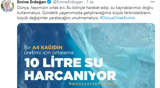 Emine Erdoğan, Twitter hesabından "Dünya Ortak Evimiz" etiketiyle yaptığı paylaşımda, "Dünya, hepimizin ortak evi. Bu bilinçle hareket edip, su kaynaklarımızı doğru kullanmalıyız. Gündelik yaşamımızda geliştireceğimiz küçük farkındalıkların, büyük değişimler yaratacağını unutmamalıyız." ifadelerini kullandı.