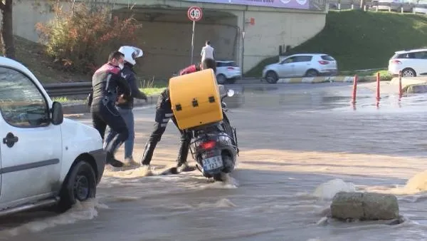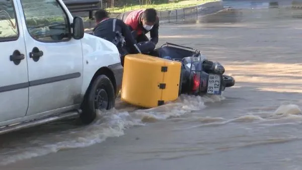 Suyun bastığı yolu gören bir motosiklet sürücüsü, bir süre sağa yanaşarak bekledi. Daha sonra hareket eden motosikletli kısa süre sonra suya kapılarak düştü.