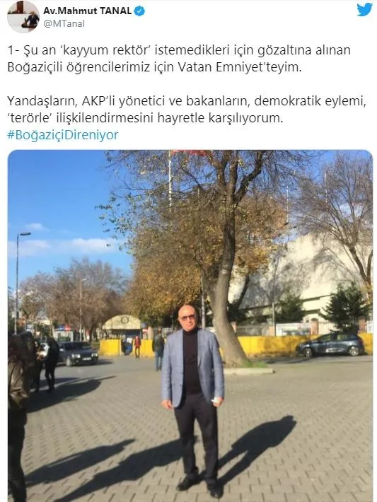 CHP İstanbul Milletvekili Mahmut Tanal, gözaltına alınanlara destek vermek için Vatan Emniyet'e gitti. Ziyaretini sosyal medya hesabından duyuran Tanal, "Şu an 'kayyum rektör' istemedikleri için gözaltına alınan Boğaziçili öğrencilerimiz için Vatan Emniyet'teyim" dedi.