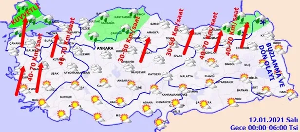 Rüzgarın; Marmara'nın güneyi, Ege, Batı Akdeniz, İç Anadolu'nun kuzey kesimleri ile Orta ve Doğu Karadeniz'in iç kesimlerinde kuvvetli ve yer yer kısa süreli fırtına (40-70 km/saat) şeklinde esmesi beklendiğinden meydana gelebilecek olumsuzluklara karşı dikkatli ve tedbirli olunması gerekmektedir.