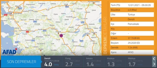 Son dakika haberine göre Denizli'de korkutan bir deprem meydana geldi. 12 Ocak Denizli depreminin 4 büyüklüğünde olduğu açıklandı. AFAD'dan yapılan son dakika açıklamasında "Saat 09.30'da merkezüssü Denizli'nin Pamukkale ilçesi olan 4.0 (Mw) büyüklüğünde bir deprem meydana geldi." denildi. Depremin 7,24 kilometre derinlikte olduğu belirlendi. Deprem çevre illerden de hissedildi. Son depremler, günün ilk saatleri itibariyle sarsıntı hisseden pek çok kişi tarafından sorgulanıyor. Yurdun pek çok noktasında meydana gelen son depremler, internet üzerinden araştırılmaya devam ediliyor. Peki, yayımlanan son verilere göre son depremler nerede meydana geldi? İşte 12 Ocak 2021 tarihli son depremler listesi. Denizli Valisi Ali Fuat Atik, Pamukkale ilçesinde meydana gelen 4 büyüklüğündeki depremle ilgili herhangi bir olumsuz durumun olmadığını bildirdi.