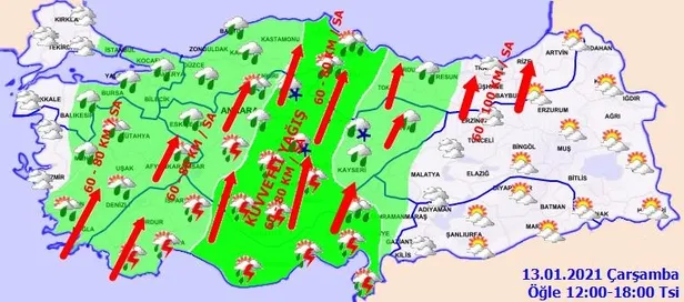 KUVVETLİ YAĞIŞ VE FIRTINA UYARISI: Yağışların İç Ege, Akdeniz, İç Anadolu, Batı ve Orta Karadeniz ile Muğla'nın doğu ilçeleri, Giresun, Malatya, Elazığ, Erzincan, Tunceli ve Bingöl çevrelerinde güneyli kuvvetli rüzgarlarla birlikte yerel olarak kuvvetli olması beklendiğinden meydana gelebilecek ulaşımda aksamalar, su baskını, çatı uçması, ağaç devrilmesi, soba zehirlenmeleri gibi olumsuzluklara karşı dikkatli ve tedbirli olunmalıdır.