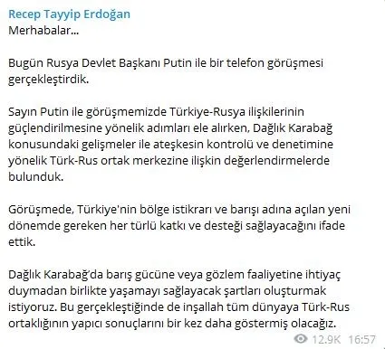 Bugün Rusya Devlet Başkanı Putin ile bir telefon görüşmesi gerçekleştirdik.