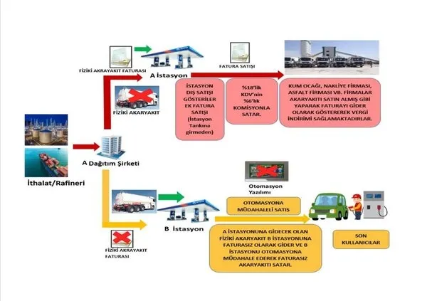 Akaryakıt istasyonlarından 608 milyon litre akaryakıt satış verisinin otomasyon sistemlerine müdahale edilerek silindiği tespit edildi. Silinen akaryakıtın güncel maddi değerinin yaklaşık 3,6 milyar TL olduğu ve MASAK raporuna göre devletin yıllık 3 milyar TL, 5 yıl içerisinde 15 milyar TL zarara uğratıldığı belirlendi.