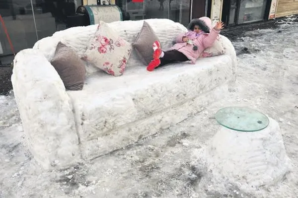 Hakkari'nin Yüksekova ilçesinde de yoğun kar yağışını fırsat bilen gençler, biriken karlarla, kanepe, buzdolabı ve çamaşır makinesi yaptı.