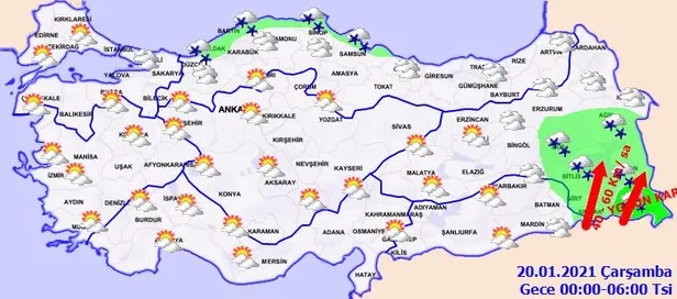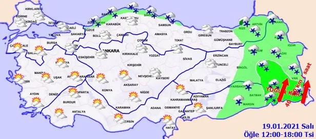 Meteoroloji Genel Müdürlüğü tarafından yapılan son değerlendirmelere göre: ülkemiz genelinin parçalı ve çok bulutlu, Doğu Akdeniz'in doğusu, Batı Karadeniz kıyıları, Doğu ve Güneydoğu Anadolu ile İstanbul, Kocaeli, Sakarya'nın kuzey kesimleri, Samsun, Rize, Artvin çevreleri ve Trabzon'un doğu ilçelerinin yağışlı geçeceği tahmin ediliyor. Akdeniz kıyı kesimlerinde yağmur ve sağanak, yağış alan diğer yerlerde karla karışık yağmur ve kar şeklinde görülecek yağışların; Güneydoğu Anadolu'nun doğusu ve Doğu Anadolu'nun güneydoğusu, Şanlıurfa, Zonguldak ve Bartın çevreleri ile Kastamonu'nun kıyı ilçelerinde kuvvetli ve yer yer yoğun kar şeklinde olması bekleniyor. Ülkenin iç kesimlerinde kuvvetli buzlanma ve don olayı bekleniyor.