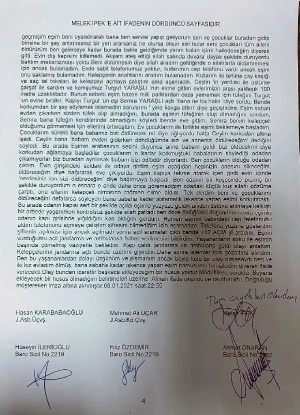 İpek, " Aynı odada oturmamıza rağmen benim cep telefonuma WhatsApp mesajlaşması üzerinden 'Ben ayrılmak istiyorum' şeklinde mesaj attı. Ben de 'Sen bilirsin' diye cevap yazdım. Tekrar 'Diğer odaya gider misin' diye mesaj attı. Ben de cevap vermeden çocukları alarak diğer odaya gittim. Eşim 'Çocukların velayeti hakkında konuşmak istiyorum, madem gelmiyorsan çocukların biri sende biri bende kalsın' diye mesaj attı. Ben de 'İkisi de sende kalsın ayırmayalım, ben nasıl olsa daha sonra senden çocukları alırım' diye mesaj attım. Bu şekilde boşanmamız üzerine mesajlaştık. Ancak hiç konuşmadık Eşim benim adıma ruhsatlı olan yivli av tüfeğiyle içeri girdi. Tüfeğim normalde salonda duvara dayalı kılıfın içinde dururdu. Bana 'Son duanı et kelimeyi şahadet getir' dedi.