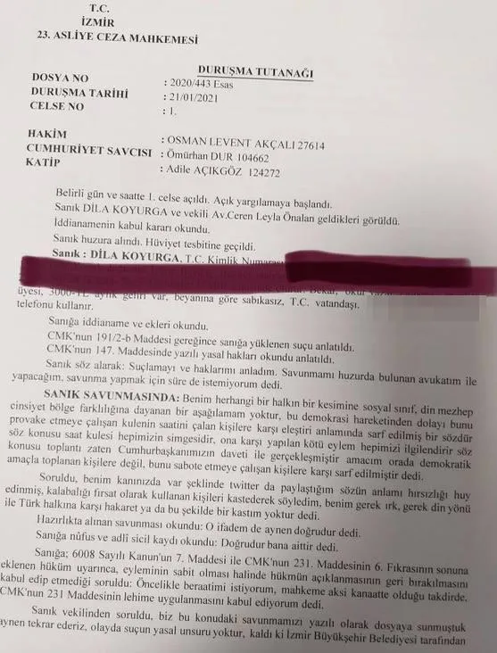 Dila Koyurga'nın; 15 Temmuz paylaşımları nedeniyle halkı kin ve düşmanlığa tahrik suçundan yargılandığı davanın ilk duruşmasında da beraat ettiği bildirildi. İzmir 25. Asliye Ceza Mahkemesi; Dila Koyurga'nın paylaşımlarıyla suçun yasal unsurlarının oluşmadığına karar verdi.