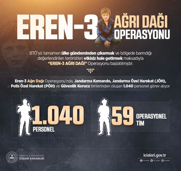 Son dakika haberine göre İçişleri Bakanlığı, "Jandarma Komando, Jandarma Özel Harekat, Polis Özel Harekat ve Güvenlik Korucu timlerinden oluşan 1040 personelin görev aldığı 'Eren-3 Ağrı Dağı' Operasyonu başlatıldı." açıklamasında bulundu.