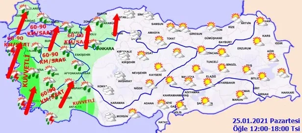 KUVVETLİ RÜZGAR UYARISI: Yapılan son değerlendirmelere göre; Ege, Marmara, Batı Akdeniz'in iç kesimleri ve Batı Karadeniz'de güneyli yönlerden kuvvetli rüzgar ve fırtına (60-90 km/sa, yüksek kesimlerde 90-120 km/sa) bekleniyor. Akşam saatlerinde Kıyı Ege'den başlayarak zamanla diğer bölgelerde de fırtınanın etkisini kaybedeceği tahmin ediliyor. Fırtınanın oluşturabileceği ulaşımda aksamalar, soba ve doğalgaz kaynaklı zehirlenmeler, çatı uçması gibi olumsuzluklara karşı dikkatli ve tedbirli olunmalıdır.
