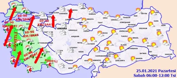 RÜZGAR: Genellikle güney ve güneybatı (Lodos), Güneydoğu Anadolu'da kuzeydoğu ve doğulu yönlerden hafif, ara sıra orta kuvvette; İç Anadolu'nun kuzeybatısında kuvvetli (40-60 km/sa), Ege, Marmara, Batı Akdeniz'in iç kesimleri ve Batı Karadeniz'de güneyli yönlerden kuvvetli rüzgar ve fırtına (60-90 km/sa, yüksek kesimlerde 90-120 km/sa) şeklinde esmesi bekleniyor.
