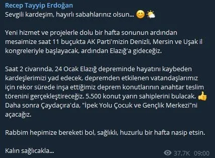 Başkan Recep Tayyip Erdoğan, Telegram hesabından bir mesaj paylaştı. Başkan Erdoğan, "Saat 2 civarında, 24 Ocak Elazığ depreminde hayatını kaybeden kardeşlerimizi yad edecek, depremden etkilenen vatandaşlarımız için rekor sürede inşa ettiğimiz deprem konutlarının anahtar teslim törenini gerçekleştireceğiz. 5.500 konut yarın sahiplerini bulacak. Daha sonra Çaydaçıra'da, "İpek Yolu Çocuk ve Gençlik Merkezi"ni açacağız." dedi. Erdoğan mesajında günlük programının detaylarına yer verdi.