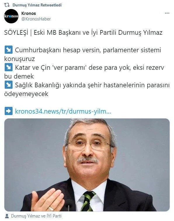 Merkez Bankası eski başkanı ve İYİ Parti Ankara Milletvekili Durmuş Yılmaz, Fetullahçı Terör Örgütü'nün (FETÖ) yönettiği ve daha önce defalarca kapatılan haber sitesi Kronos'la bir söyleşi gerçekleştirdi.