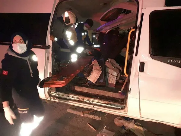 Tavuk çiftliğinde çalışan işçileri taşıyan Galip Dinçer yönetimindeki 10 AEM 464 plakalı minibüs, kavşaktan dönüş yapmak için yola çıkan İsmail Dere yönetimindeki 46 ACS 581 plakalı TIR ile çarpıştı.