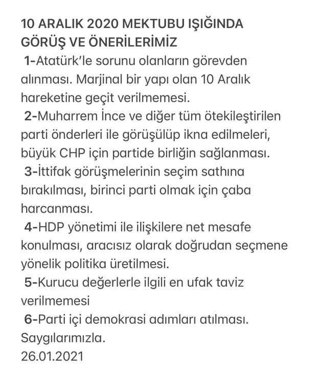 "CHP yöneticileri yanlışları düzeltmektense bende bozguncu bir ruh görmüşlerdir. Başka partileri parlatan CHP'ye geldik. Yabancılardan demokrasi dilenen CHP'ye geldik. Atatürk demekten imtina eden CHP'ye geldik. HDP yönetimine ses çıkaramayan CHP'ye geldik. Kumpaslarla dizayn edilen kurultaylara, aklına istifa gelmeyen makam sevicilerin olduğu CHP'ye geldik. Abdullah Gül ve türevlerine bel bağlayan CHP'ye geldik. HDP'nin dizinin dibinde iktidarı arayan CHP'ye geldik. Silivri'de teslim olmadım şimdi de olmuyorum. O zaman tehditlere boyun eğmedim şimdi de eğmiyorum."
