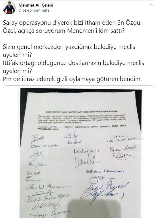 İzmir milletvekili Mehmet Ali Çelebi, yaptığı son dakika açıklamasında Özgür Özel'e sert ifadelerle yüklendi. CHP'li Menemen Belediyesi'nde ortaya çıkan yolsuzluğun ardından yapılan 'Başkan Vekilliği' seçiminde Millet İttifakı'nın verdiği fireyi hatırlatan Çelebi, sosyal medya üzerinden "Saray operasyonu diyerek bizi itham eden Sn Özgür Özel, açıkça soruyorum Menemen'i kim sattı? Sizin genel merkezden yazdığınız belediye meclis üyeleri mi? İttifak ortağı olduğunuz dostlarınızın belediye meclis üyeleri mi? Pm de itiraz ederek gizli oylamaya götüren bendim." dedi.