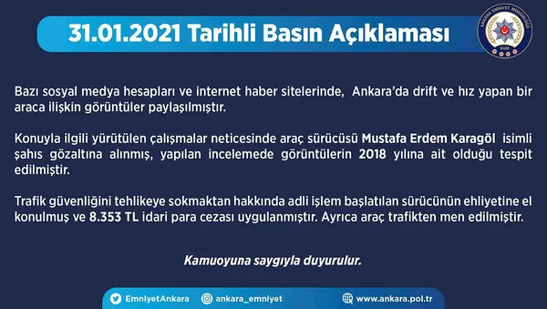 Olayla ilgili Ankara Emniyet Müdürlüğünün Twitter hesabından yapılan açıklamada, "Konuyla ilgili yürütülen çalışmalar neticesinde araç sürücüsü Mustafa Erdem Karagöl isimi şahıs gözaltına alınmış, yapılan incelemede görüntülerin 2018 yılına ait olduğu tespit edilmiştir. Trafik güvenliğini tehlikeye sokmaktan hakkında adli işlem başlatılan sürücünün ehliyetine el konulmuş ve 8 bin 353 TL idari para cezası uygulanmıştır. Ayrıca araç trafikten men edilmiştir" denildi.