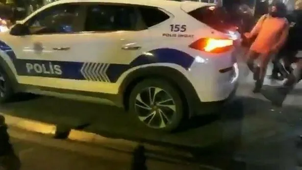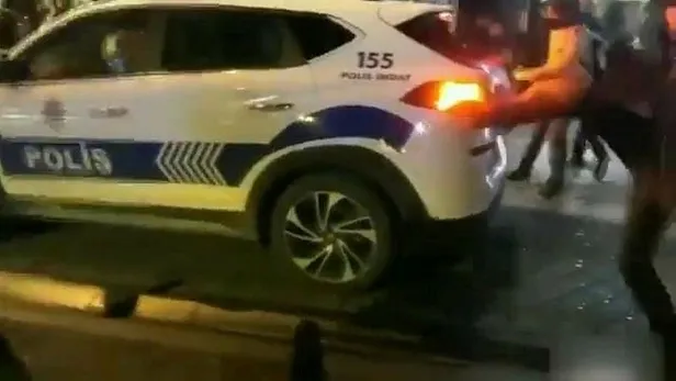 Polisler, göstericilerin ekip otosunun önüne devirdikleri çöp konteynerini de araçlarının önünde sürükleyerek uzaklaştı. O anlar kameraya yansıdı.