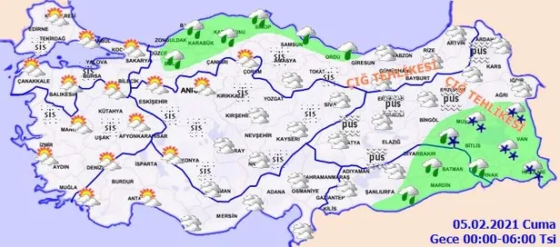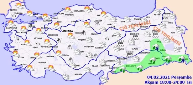 Meteoroloji Genel Müdürlüğü tarafından yapılan son değerlendirmelere göre, Batı Karadeniz, Doğu ve Güneydoğu Anadolu ile Osmaniye, Hatay Kahramanmaraş, Samsun ve Ordu çevrelerinin yağışlı, diğer yerlerin parçalı ve az bulutlu geçeceği tahmin ediliyor. Yağışların genellikle yağmur ve sağanak, Doğu Anadolu'nun kuzeyi ve doğusunda kar şeklinde olması bekleniyor. Sabah ve gece saatlerinde iç ve doğu kesimlerde buzlanma ve don olayı ile birlikte yer yer pus ve sis olayı bekleniyor. Doğu Karadeniz'in iç kesimleri ile Doğu Anadolu'nun doğusunda yüksek kar örtüsünün olduğu dik yamaçlarda çığ oluşma tehlikesi bulunmaktadır.