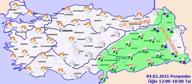 ÇIĞ UYARISI: Doğu Karadeniz'in iç kesimleri ile Doğu Anadolu'nun doğusunda yüksek kar örtüsünün bulunduğu dik yamaçlarda çığ oluşma riski olmasından meydana gelebilecek olumsuzluklara karşı dikkatli ve tedbirli olunması gerekmektedir.