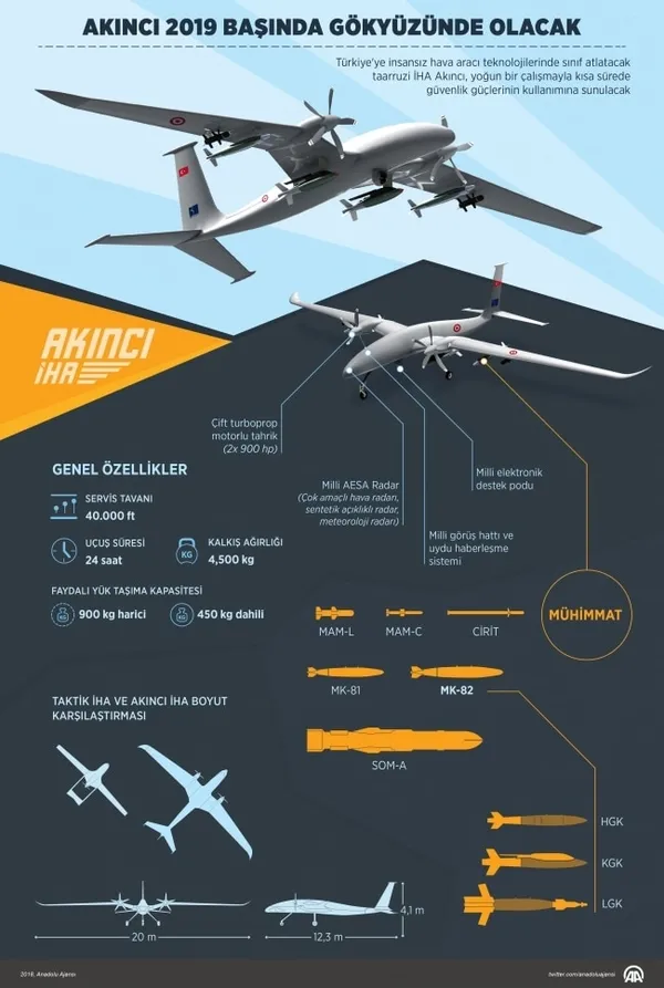 İçinde 6 yapay zeka bilgisayarı var. Hem gözlüyor hem karar veriyor. İnsan gözüyle dahi tespit edemediği kara hedeflerini tespit edebiliyor. Havadan bombardıman da icra edebiliyor. İnsanlı savaş uçaklarının yükünü azaltacak nitelikte. Türk hava gücünün yeni yıldızı Akıncı TİHA.