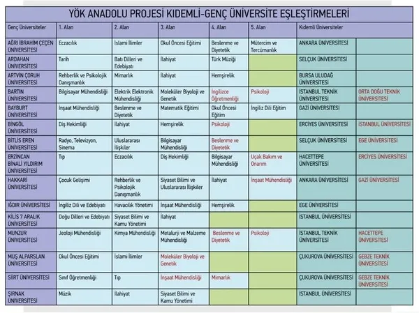 YÖK Anadolu Projesi'nde 12 kıdemli üniversitenin kıdemli öğretim üyeleri 2006'dan sonra kurulan 15 genç üniversitenin çeşitli bölümlerdeki öğrencilerine ders verecek ve araştırma alanlarında danışmanlık yaparak yol gösterecek. Üniversiteler araştırma alt yapılarını ve kütüphane olanaklarını birbirlerine açacak.