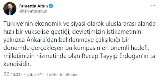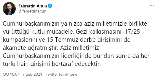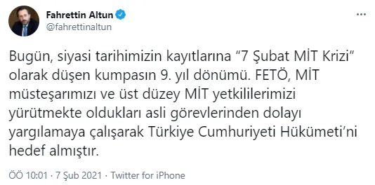 Resmi Twitter hesabından '7 Şubat MİT Krizi' paylaşımında bulunan İletişim Başkanı Fahrettin Altun, "Bugün, siyasi tarihimizin kayıtlarına "7 Şubat MİT Krizi" olarak düşen kumpasın 9. yıl dönümü. FETÖ, MİT müsteşarımızı ve üst düzey MİT yetkililerimizi yürütmekte oldukları asli görevlerinden dolayı yargılamaya çalışarak Türkiye Cumhuriyeti Hükümeti'ni hedef almıştır." ifadelerine yer verdi.