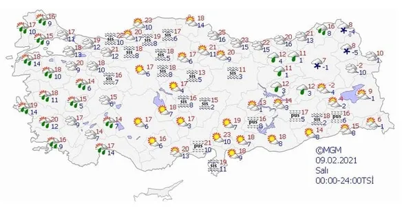 Meteoroloji Genel Müdürlüğü tarafından yapılan son değerlendirmelere göre; Yurdun kuzey ve batı kesimlerinin parçalı ve yer yer çok bulutlu, Marmara'nın batısı ve Kıyı Ege ile İstanbul, Yalova, Bursa, Kütahya, Uşak, Antalya, Isparta, Zonguldak, Bartın, Artvin, Erzurum ve Ardahan çevrelerinin yağışlı, diğer yerlerin az bulutlu ve açık geçeceği tahmin ediliyor. Yağışların genellikle yağmur ve sağanak, gece saatlerinde Ege kıyılarında yer yer gök gürültülü sağanak, sabah saatlerinde Erzurum ve Ardahan çevreleri ile Artvin'in yüksek kesimlerinde karla karışık yağmur şeklinde olması bekleniyor. Sabah ve gece saatlerinde doğu kesimlerde pus ve yer yer sis ile birlikte buzlanma ve don olayı görüleceği tahmin ediliyor. Doğu Karadeniz'in iç kesimleri ile Doğu Anadolu'nun güneydoğusunda çığ oluşma tehlikesi bulunmaktadır.